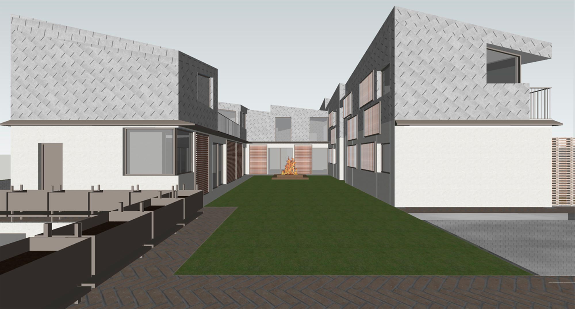 And at the center of the communal patio, also at the heart of the perfect square outlined by the plot, is a fire. Although the patio is open on one side, the square shape creates a centripetal energy.