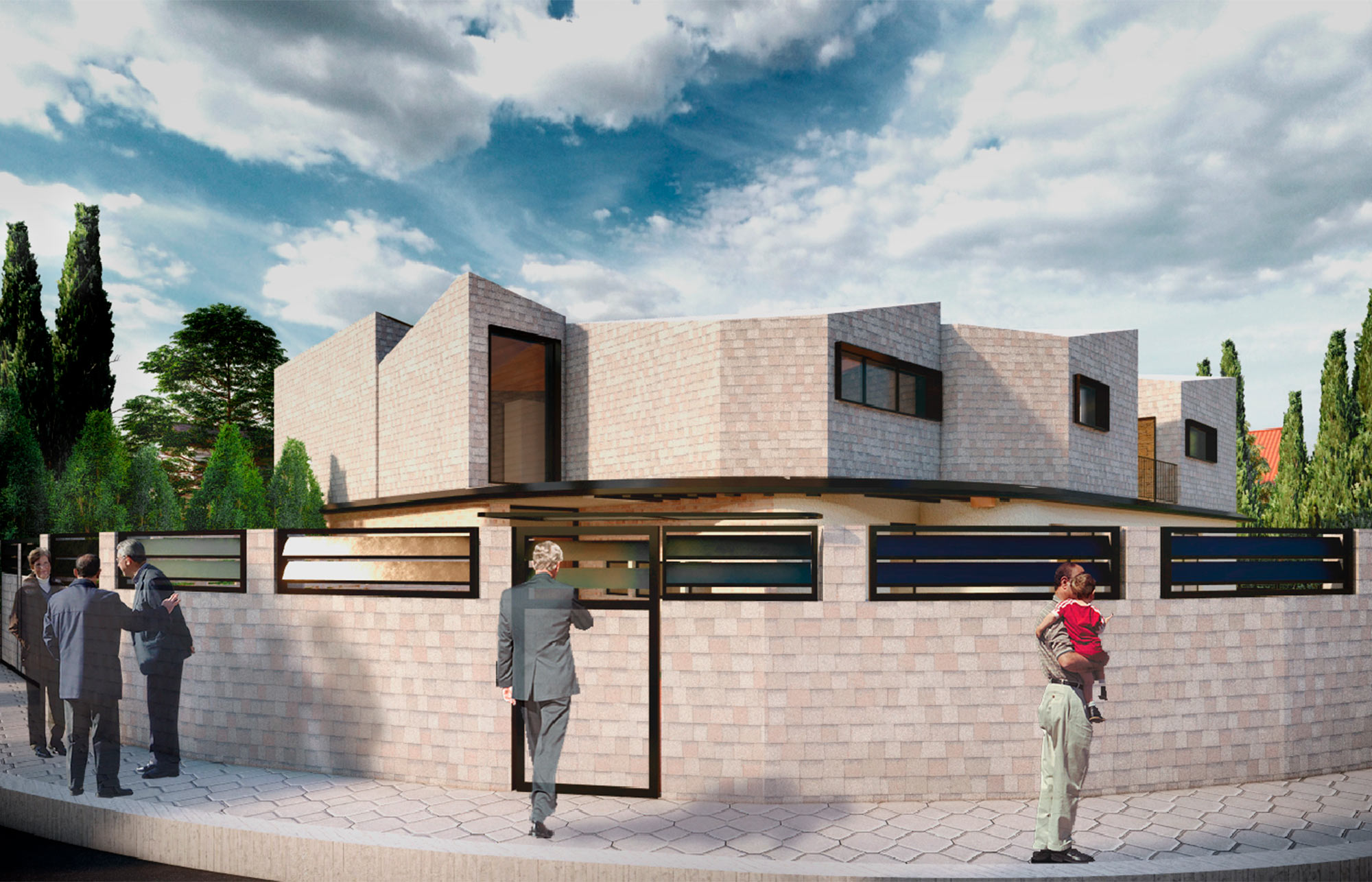 La formas rocosas de la planta superior no son, a pesar de su singularidad, percibidas como foráneas a su contexto urbano, ya que tratan de fundirse con el fondo mediante colores neutros, manteniendo una continuidad material con la valla perimetral exterior que cierra la parcela.